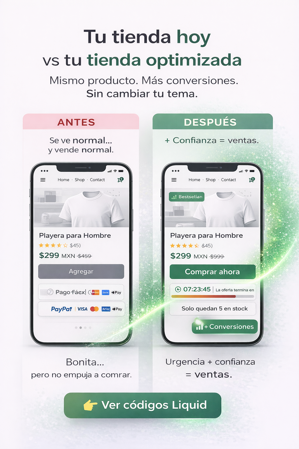Las tiendas que integran urgencia, prueba social y métodos de pago visibles pueden aumentar su tasa de conversión entre un 15% y 35%, según estudios de optimización eCommerce.